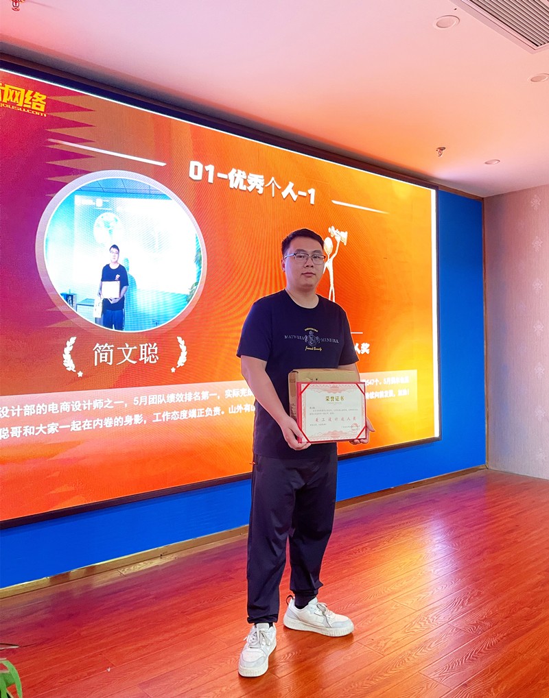 獎(jiǎng)項(xiàng)2:5月美工績(jī)效達(dá)人獎(jiǎng):簡(jiǎn)文聰。他是設(shè)計(jì)部的電商設(shè)計(jì)師之一,5月團(tuán)隊(duì)績(jī)效排名第一,實(shí)際完成3個(gè)設(shè)計(jì)版面和247個(gè)套版,總累積折算系數(shù)547個(gè)。5月偶爾也是可以看到聰哥和大家一起在內(nèi)卷的身影,工作態(tài)度端正負(fù)責(zé)。山外有山,希望你不要停止努力的腳步持續(xù)優(yōu)秀,持續(xù)向前發(fā)展,加油!